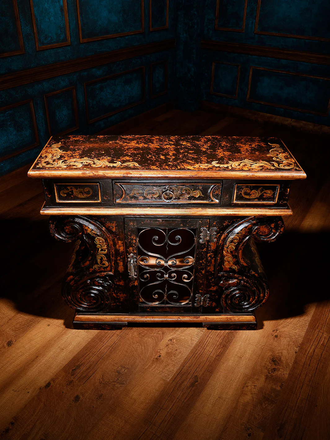 Its gracefully scrolled sides and hand-carved detailing evoke timeless elegance, while the hand-painted finish in Rustic Black adds rich depth and texture. A forged iron cabinet door adds a layer of rugged charm, beautifully balancing artful design with functionality.