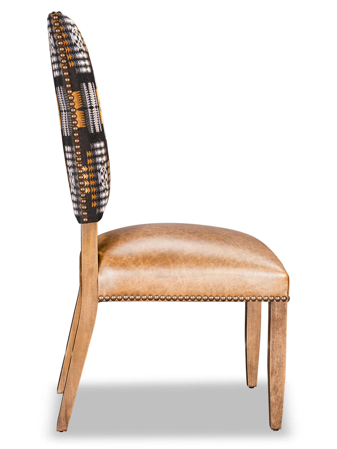 Our Dakota Southwestern Style Dining Chair is a conversation starter with its striking features. This modern rustic dining chair features an eye-catching Apache fabric design, a luxurious genuine leather seat, and an excellently crafted straight-back frame with a driftwood finish.