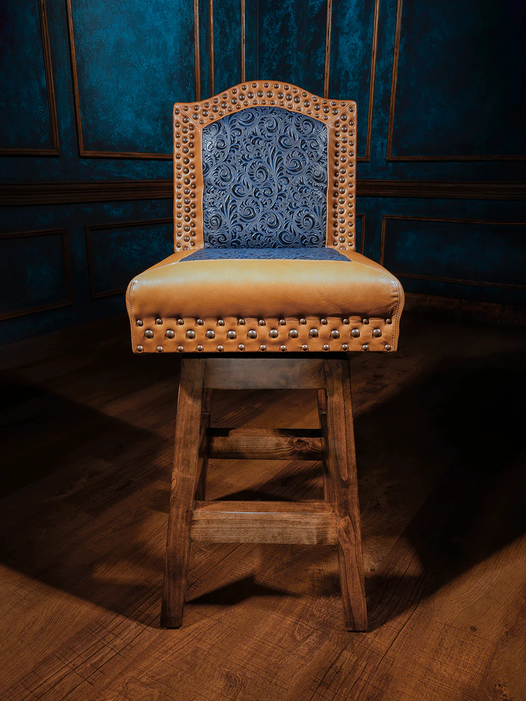 The Desert Sky Armless Chisum Western Bar Stool is a stunning addition to any home bar or kitchen counter. This high-quality armless western bar stool gives off an inviting look, with a sturdy frame, top-grade Leather, and metal studs. A luxurious western design makes for a comfortable spot at any bar. With a striking design and impeccable craftsmanship, this work of art demands attention and admiration.