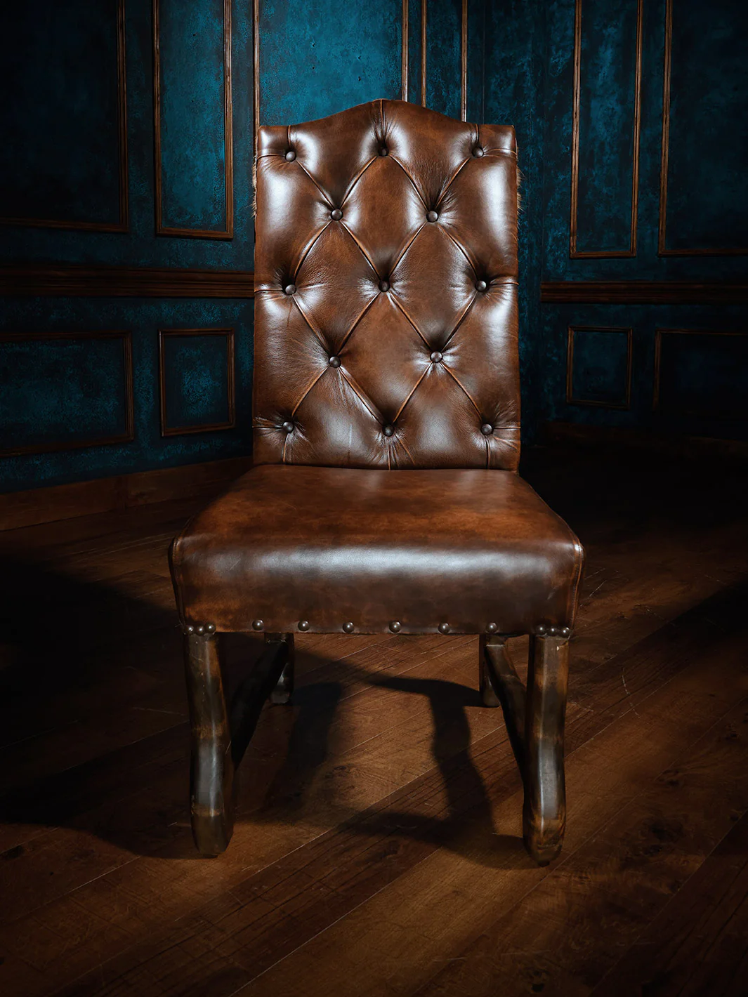 The Puglia Brown leather is embellished with tufted buttons, complementing the Axis hide back. The Eastwood Axis Back Dining Chair commands attention and adds personality to any room. Available with arms or armless.Â