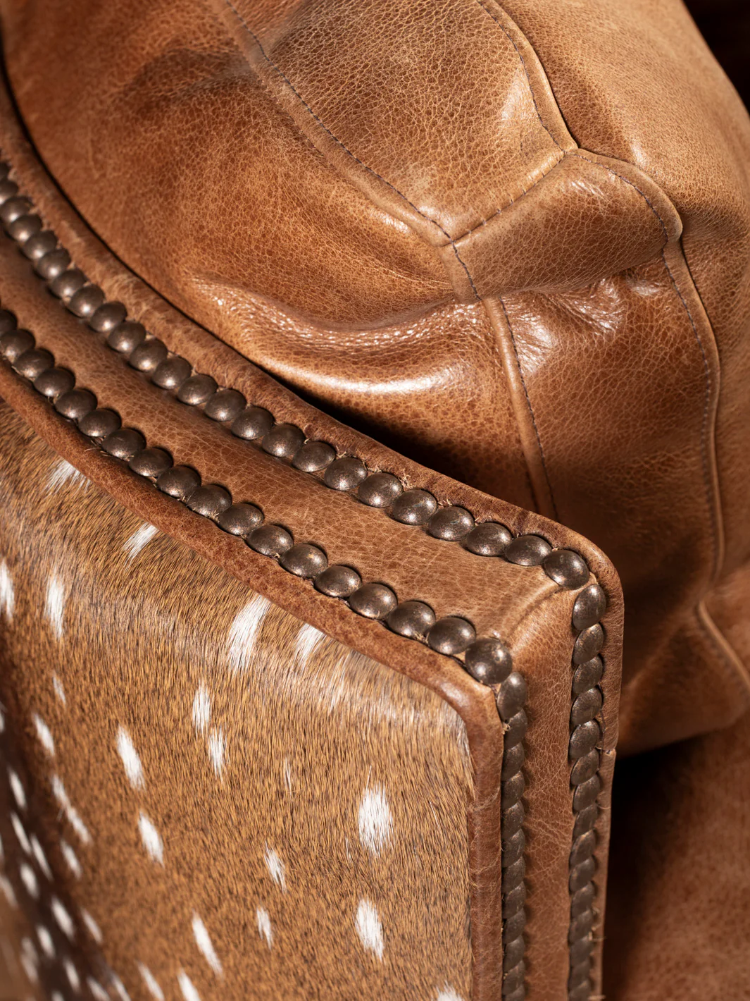 Elevate your Western retreat with the Hill Country Axis Leather Snug Swivel Recliner—a bold fusion of rustic luxury, premium top-grain leather, and handcrafted comfort. Upholstered in supple whiskey-toned leather and accented with genuine axis deer hide on the outside arms and back, this statement piece brings natural texture and untamed character to any room.