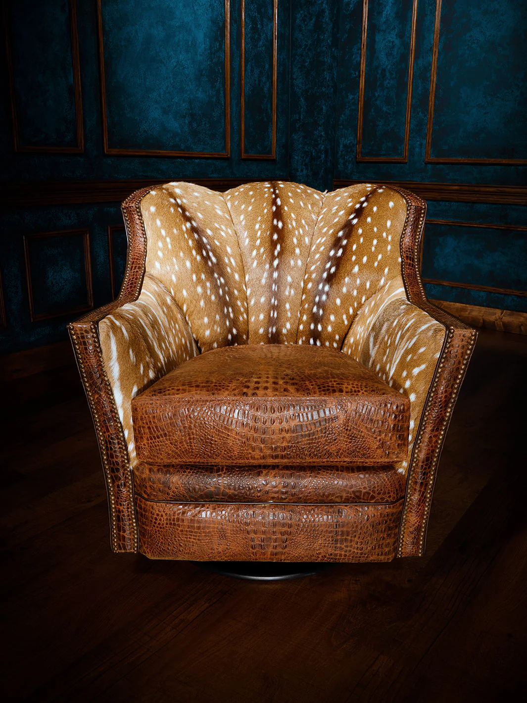 The Hunters Glenn Puma Swivel Chair is a meticulously crafted piece of rustic furniture crafted from genuine, high-quality Sierra crocodile leather and axis hide. Its quality materials and durable construction make it an enduringly stylish and comfortable addition to any home. Manufactured in Texas for unmatched craftsmanship.