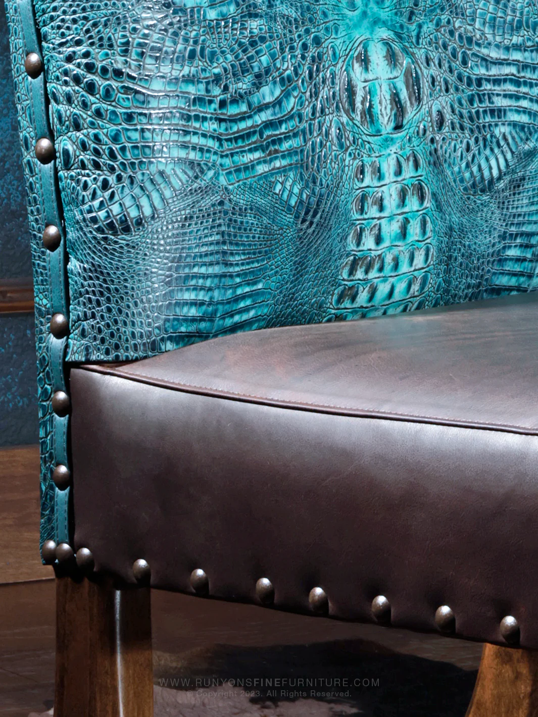 The Nile Crocodile Leather Dining Chair is the perfect addition to any interior. With a dark heirloom chocolate leather seat, and an embossed crocodile indigo pattern, this chair has a timeless, luxurious look. It's an investment piece, offering durability and comfort that will last for generations. Available with arms or armless.