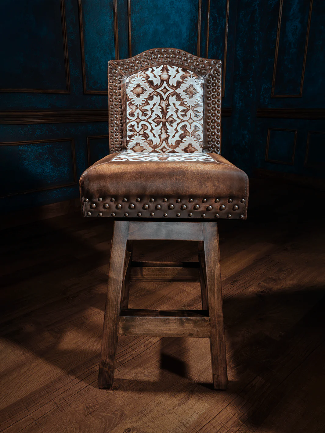 A breathtaking display of flawless design and stunning craftsmanship, the Old Henry Armless Chisum Western Leather Bar Stool is truly a piece of art. The burnished brown colored tones of the 100% top-grain leather seat that’s detailed with a classic hand-tooled Loredo Ivory Chocolate pattern are perfectly complemented with an authentic tri-color brindle cowhide outside back.
