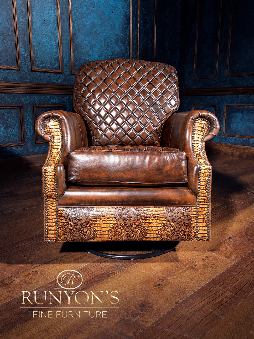 Enjoy the classic western style of the Rodeo Architect Quilted Leather Swivel Chair, upholstered with brown diamond stitch leather and medium brindle cowhide. Its comfortable armrests and swivel feature provide a unique combination of style and function.