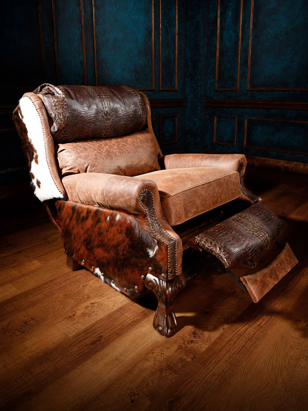A statement piece through and through, the Santa Fe Ball & Claw Push Recliner doesn't shy from taking center stage in whichever room you place it in. This cushy recliner is handcrafted with all the bells and whistles to maximize your lounging comfort—with a raised croc-embossed leather neck rest and lowered Caprieze Average Brown Leather upholstered armrests. The adjustable raised footrest is upholstered with a mix of croc leather and brown leather to give it that extra touch of luxury. The outside arm, back, and wing are upholstered with a tri-color cowhide that offers a generous display of contrast thanks to the white, brown, and black. Finished with vintage nailheads, this old-world recliner wins hearts and a top spot in your home.