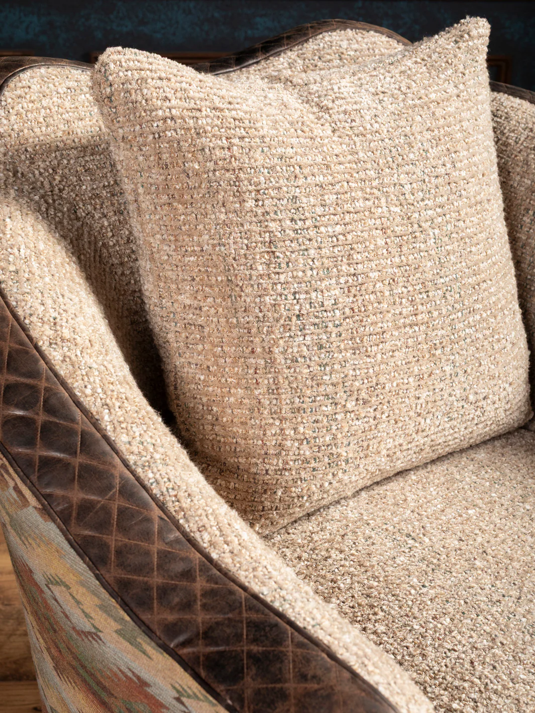 Rooted in rich tradition and refined craftsmanship, the Southwest Luxe Swivel Chair is where rustic culture meets upscale comfort. This handcrafted American-made piece brings together dimensional boucle-style fabric, hand-stitched leather trim, and a bold Southwestern woven back panel for a truly standout design. With a 360-degree swivel base and plush cushioning, it’s as functional as it is visually captivating—perfect for ranch-inspired interiors, mountain retreats, or eclectic Western living rooms.