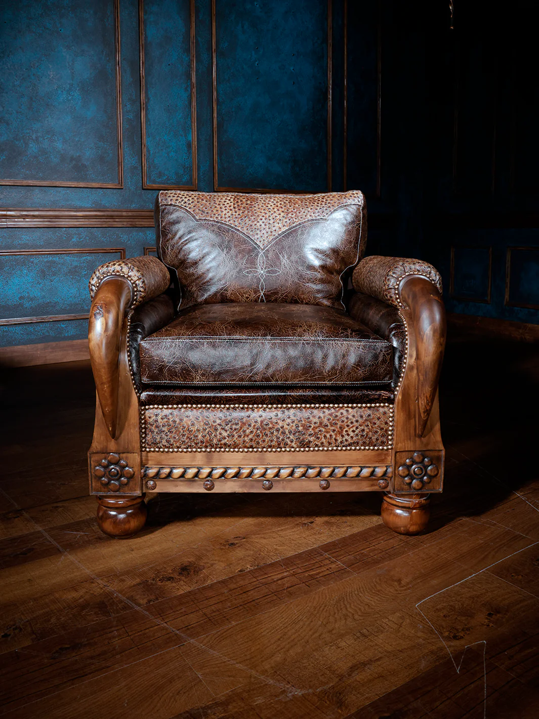 Experience luxurious Texas style with The Cattle King Leather Chair. Featuring opulent ostrich embossed body and signature hand-carved longhorn feature, this chair is sure to shine as a centerpiece of your home. The grey and white brindle cowhide back adds the perfect touch to this Texas-made masterwork.